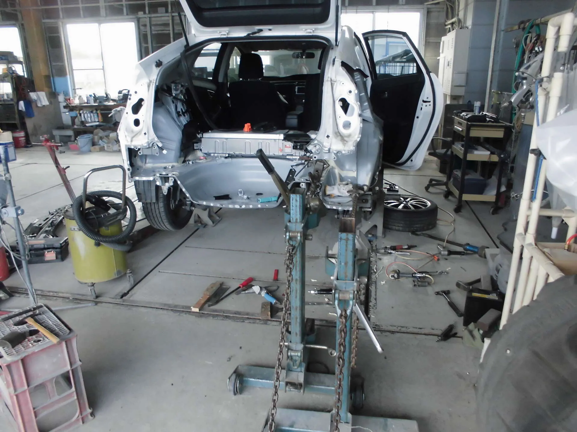 工場の中で、プリウスが静かに作業台に乗っています。